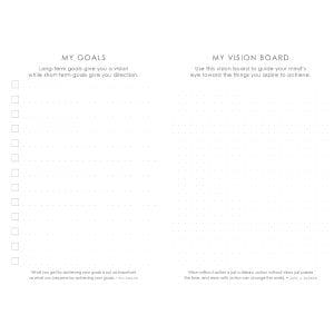 A soft blush pink tone-on-tone plaid design forms the background on the hardcover journal's front and back covers. Black pink and teal branches filled with pointy leaves grow out from a pink double hexagonal frame that is set around the sentiment. The sentiment is printed in a modern black font.