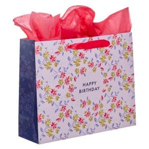 Green And Pink Flower Design Happy Birthday Large Landscape Gift Bag With Card