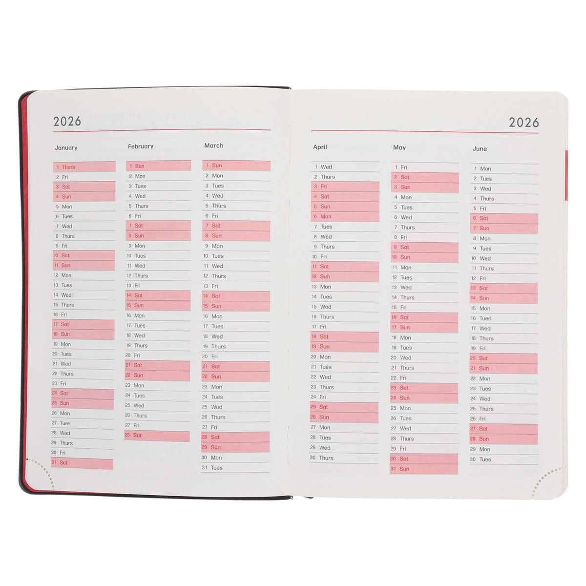 • Mini calendar for 2026 printed at the top of each page.
