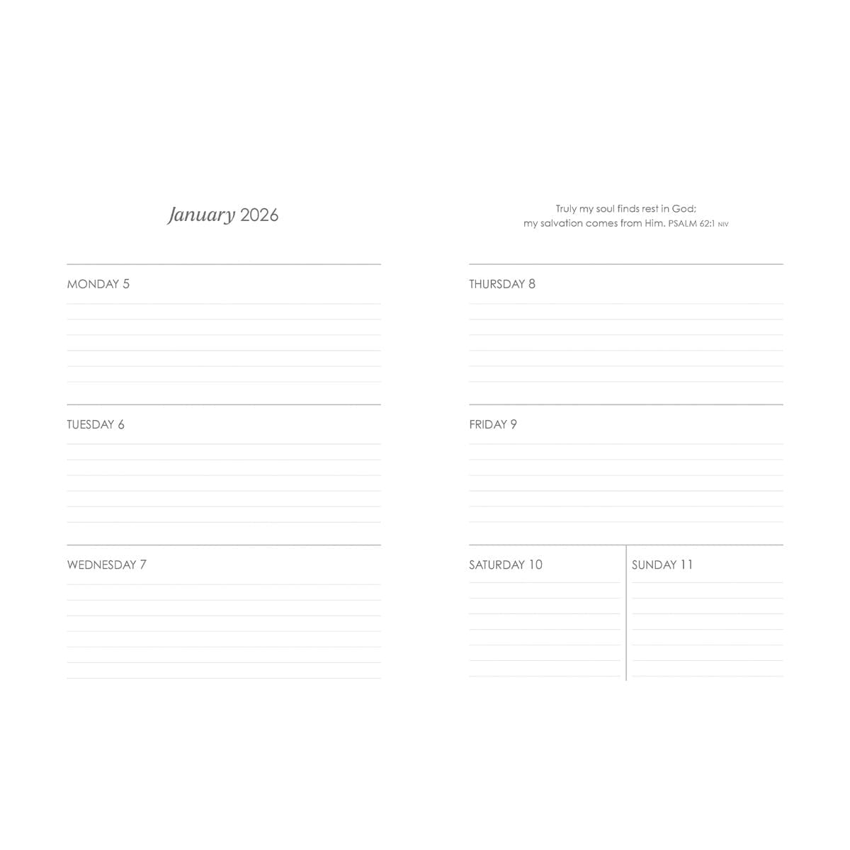 Record all your daily tasks and keep track of appointments with this simple, uncluttered 2026 weekly 12-month planner. Be encouraged by a weekly Scripture verse. At the back of the planner you’ll find space to record contacts. Dot-grid pages provide space for creative notetaking. The wire binding makes this a sturdy planner that can lie flat.