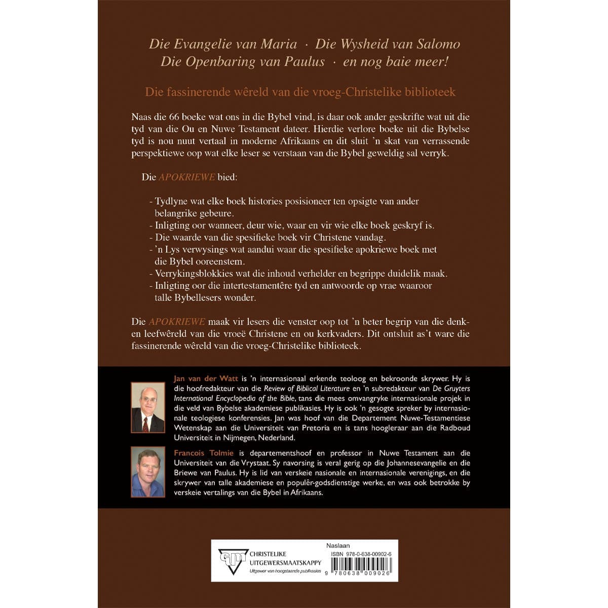 Naas die 66 boeke wat ons in die Bybel vind, is daar ook ander geskrifte wat uit die tyd van die Ou en Nuwe Testament dateer, naamlik die Apokriewe Boeke. Hierdie verlore boeke uit die Bybelse tyd is in hierdie bundel nuut vertaal in moderne Afrikaans.