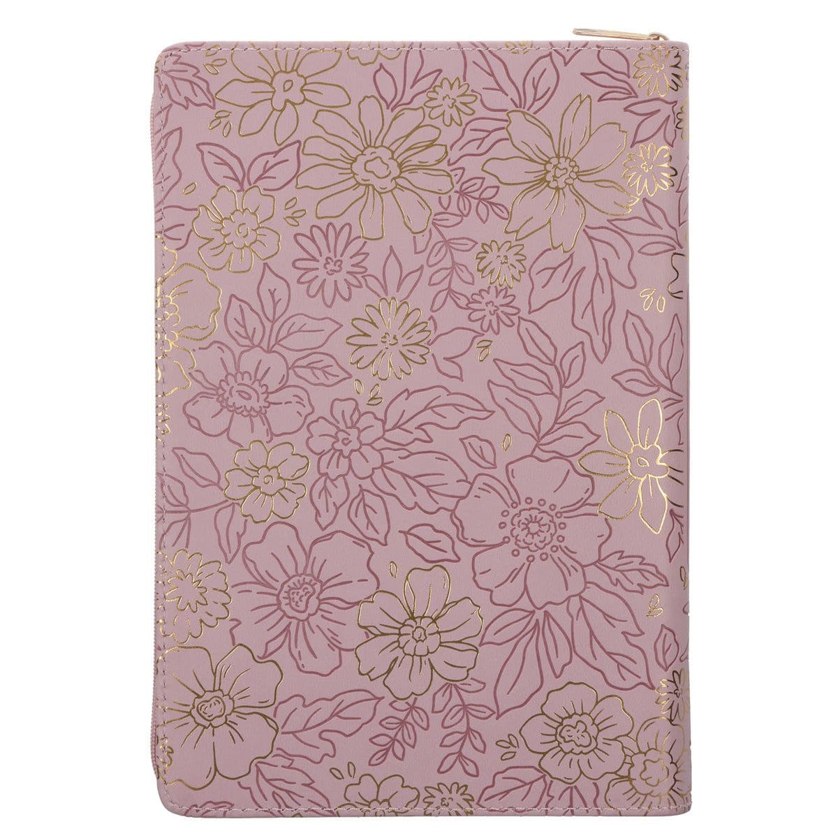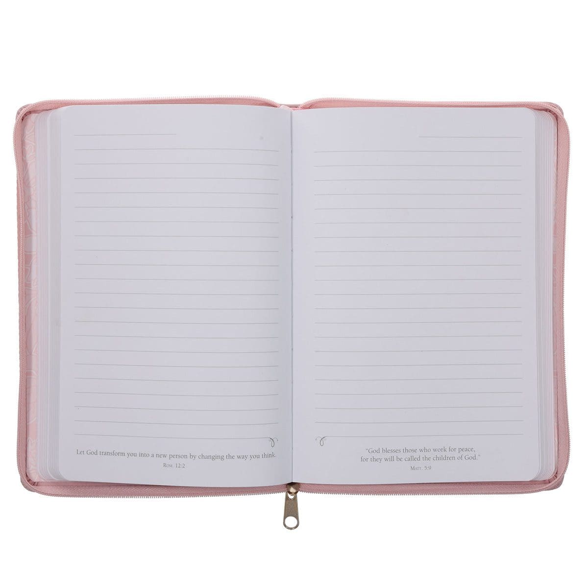 Set some time apart to journal your thoughts and prayers in this Be Still and Know Floral Pink Faux Leather Journal with Zipped Closure.