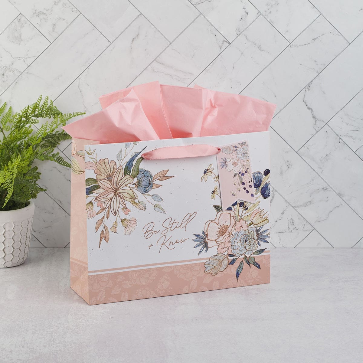 Be Still and Know Pink and Blue Floral Large Landscape Gift Bag with Gift Tag