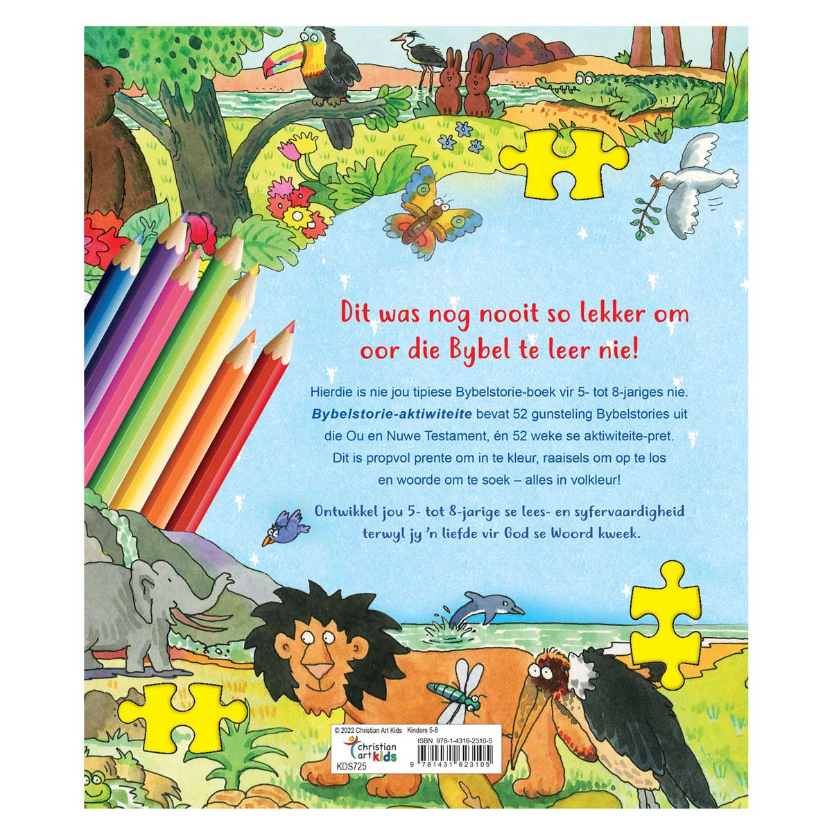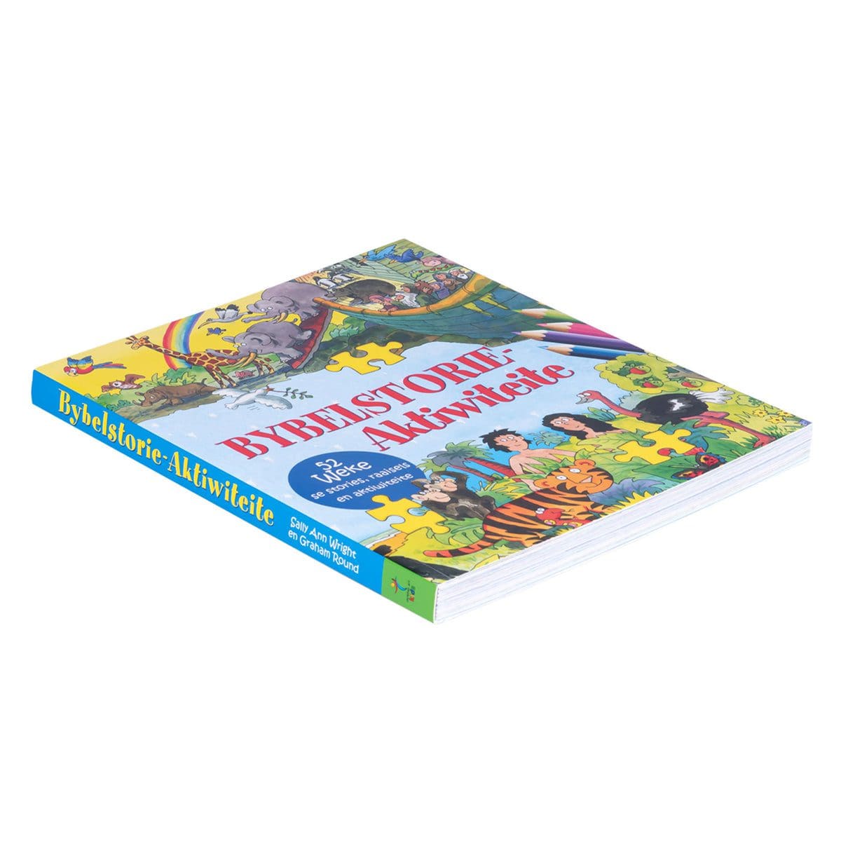Die Bybelstorie-aktiwiteitsboek is die ideale manier om ’n liefde vir God se Woord by 5- tot 8-jariges te kweek. 52 bekende Bybelstories uit die Ou en Nuwe Testament, soos Noag se ark, Josef se spesiale kleed, Dawid en Goliat, en Jesus se geboorte, wonderwerke, dood en opstanding, word op ’n maklik verstaanbare manier oorvertel. Elke storie sluit af met twee aktiwiteite soos soek die verskille, soek die woorde, kleur in volgens nommers en voltooi die prentjie.
