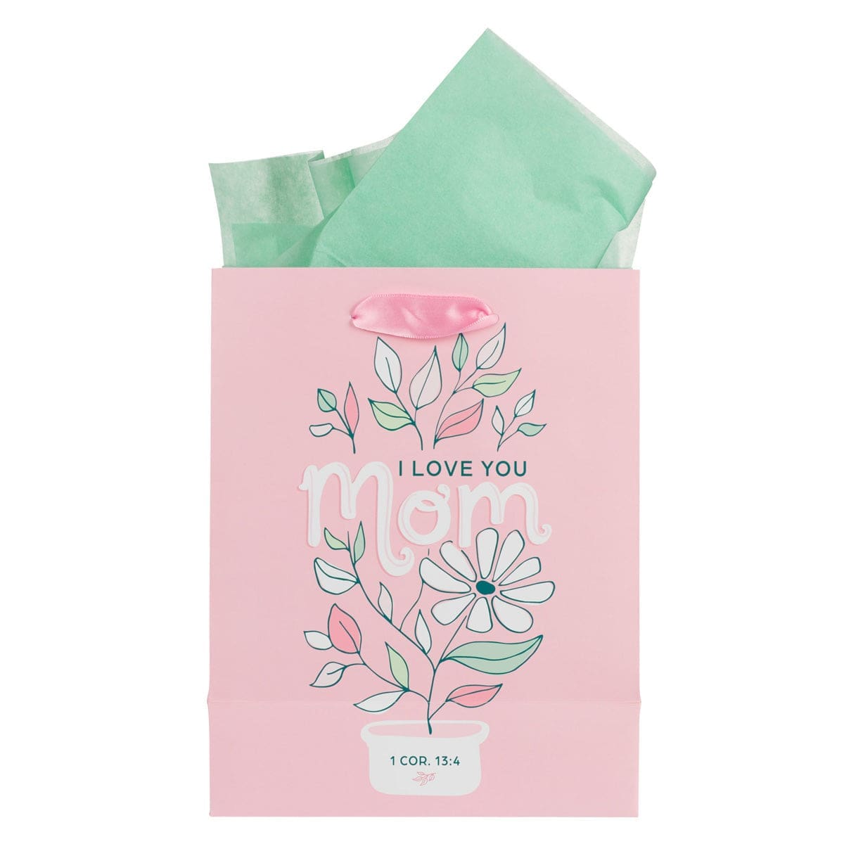 Adequate in size, the I Love You Mom Medium Gift Bag with Gift Tag will accommodate a variety of gifts.
