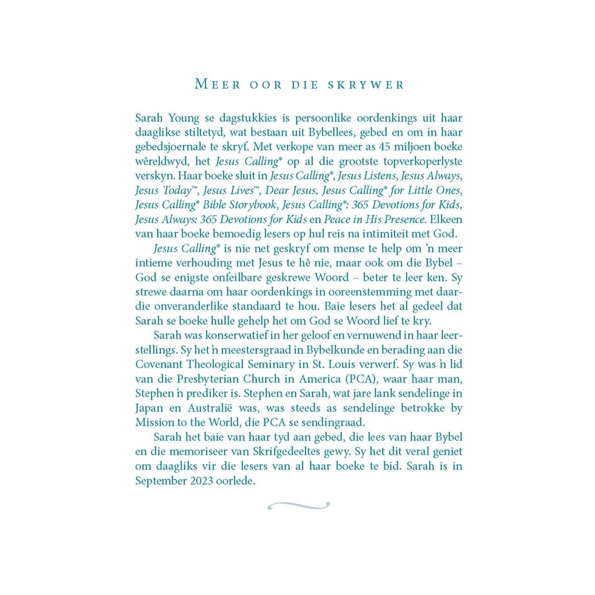 Baie van ons will graag bid, maar weet nie waar om te begin of wat om te sĂȘ nie. In Jesus luister: Dagstukkiegebede vir Vrede, Vreugde en Hoop, ‘n 366-dagstukkiegebedeboek, word jy uitgenooi om jou verhouding te verdiep met die Een wat met oneindige liefde na jou gebede luister.