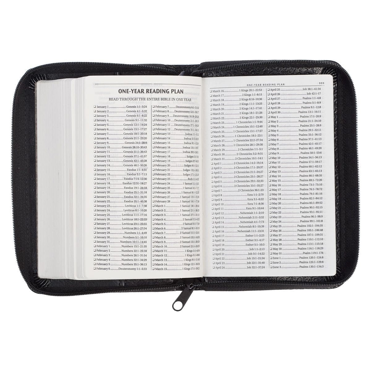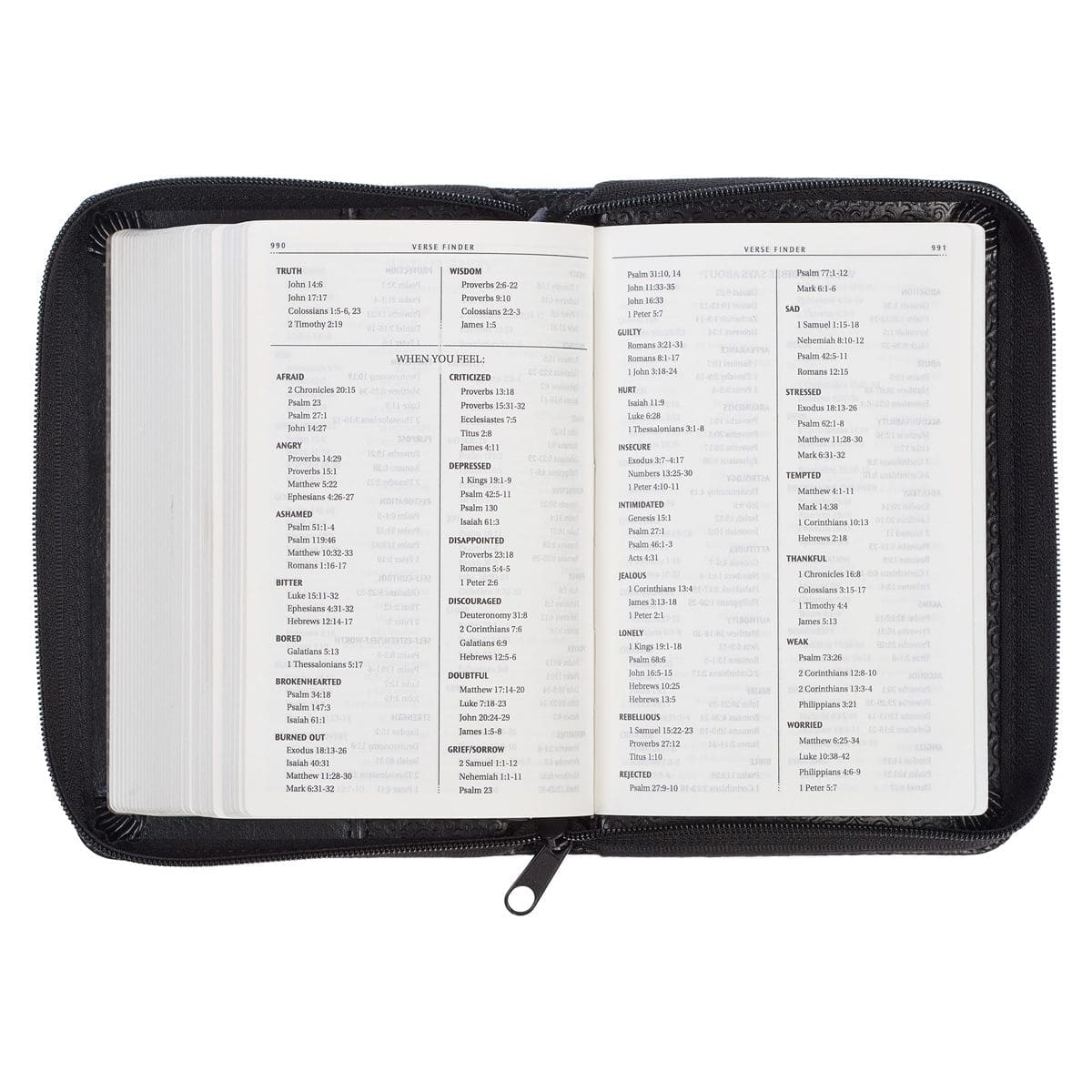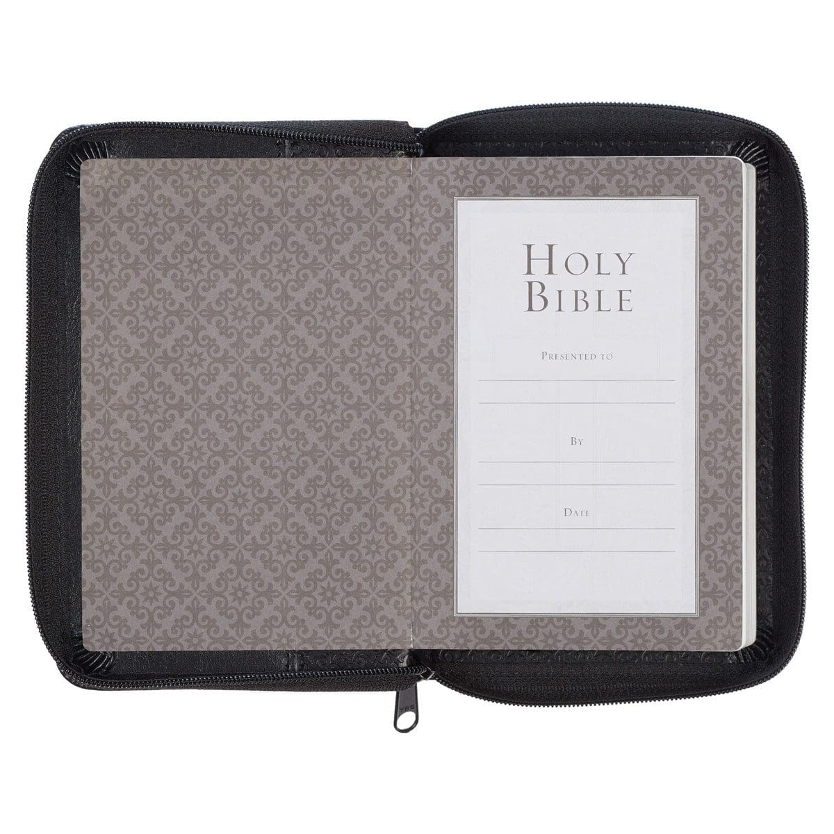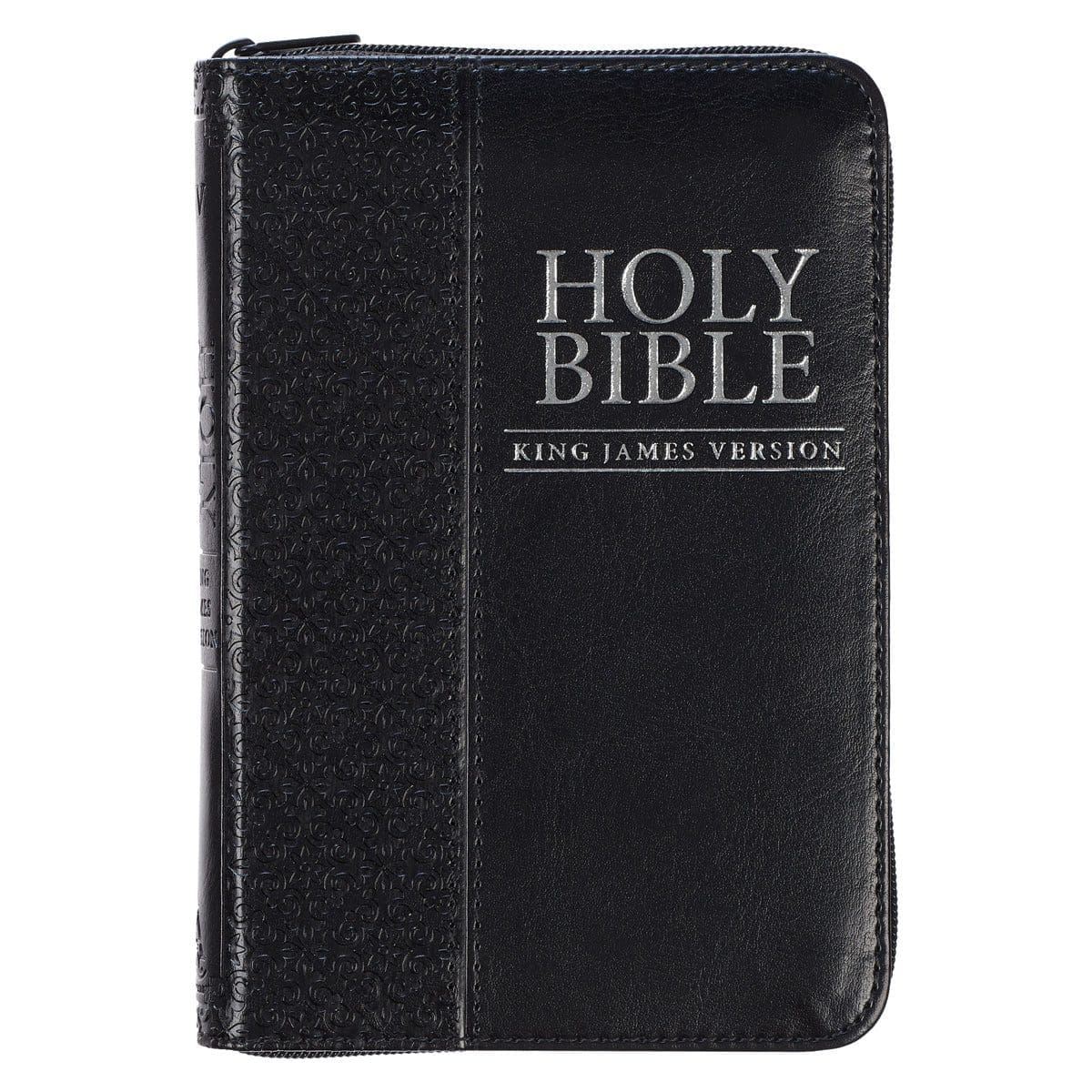 KJV Mini Pocket Bible offers the celebrated King James Version in an attractive compact size with zip, making it easy to slip into any purse, pocket or backpack. Special features include a thematic Scripture verse finder, one-year Bible reading plan, reader-friendly sub-headings, the words of Christ in red and a presentation page for gift-giving.