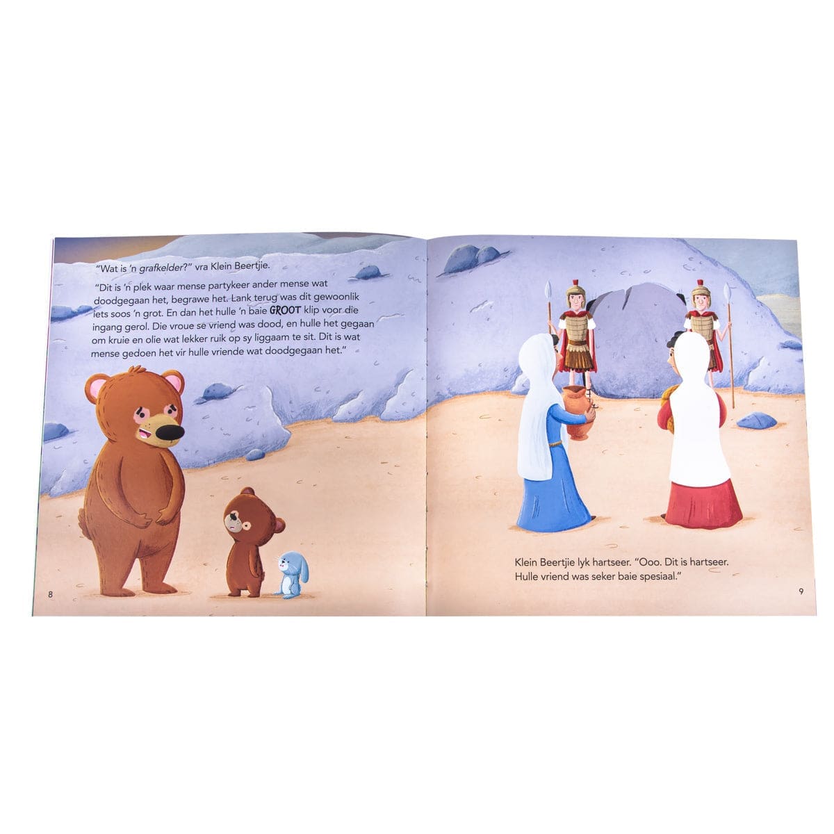 Kom leer jou kleinding van Paasfees met Klein Beertjie, wat graag Bybel lees en daarvan hou om van God te leer.