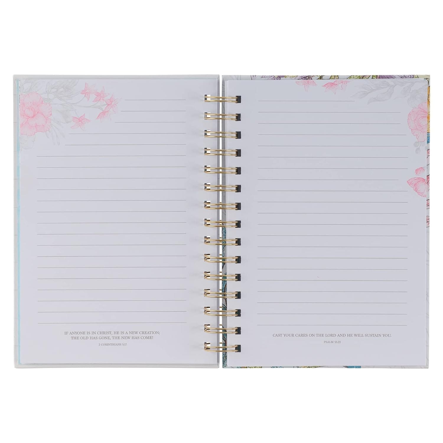The creamy white cover of the wirebound journal features a multi-colored floral design accented by gold foil-outlined flowers. The design hugs a white frame where the sentiment, taken from the NLT, is presented in black and pink-foiled letters.