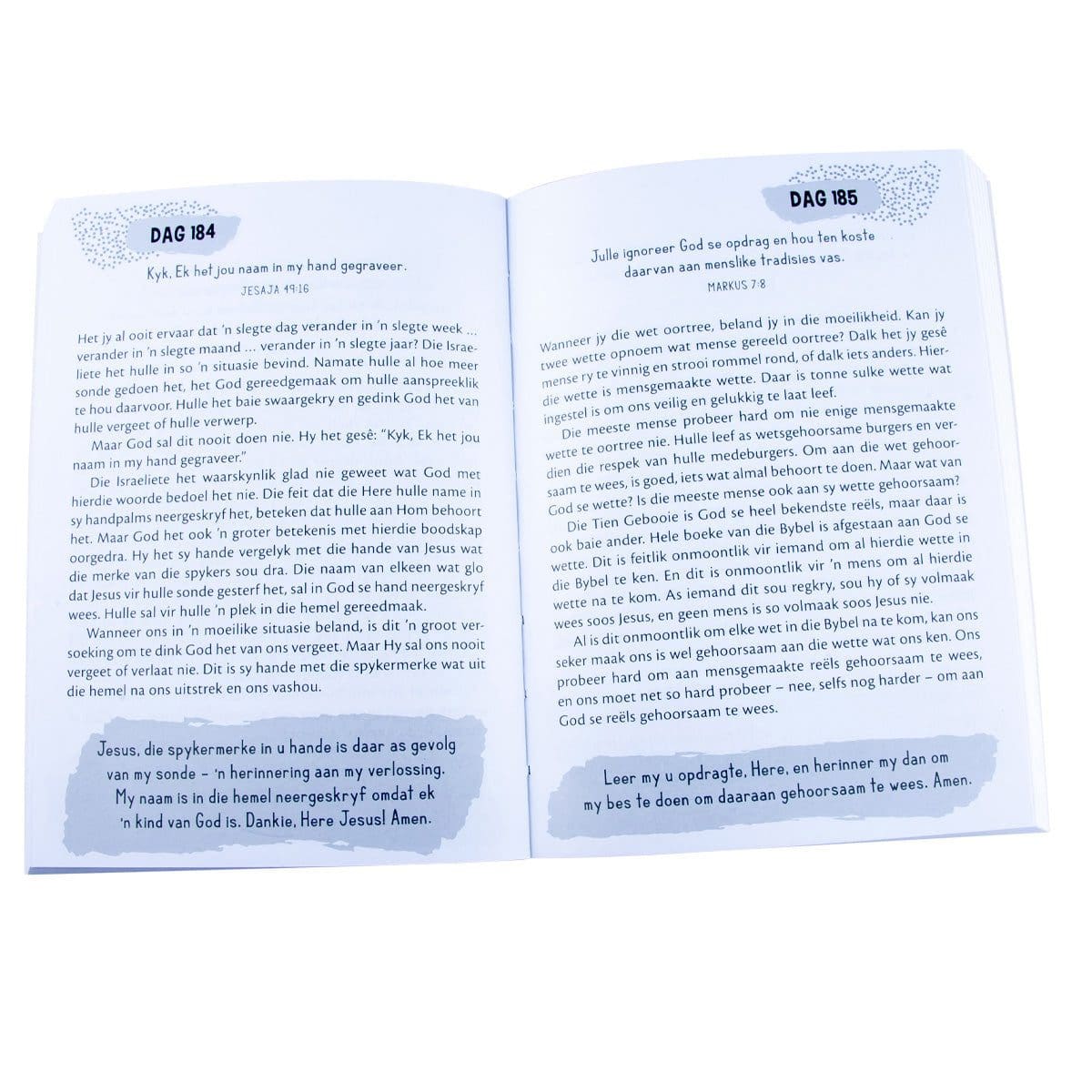 Die 365 dagstukkies in ’n Bybeldagboek vir meisies is gebaseer op van die bekendste Skrifgedeeltes en beloftes in die Bybel. Jong meisies sal elke dag van die jaar bemoedig, uitgedaag en geïnspireer word. Enkele temas wat in hierdie dagboek voorkom, is God, Jesus, die hemel, liefde, wonderwerke, wysheid en vele meer.