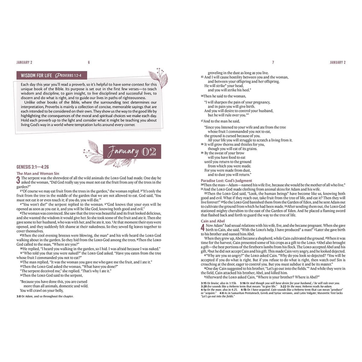 The carefully selected daily portions of Scripture passages from the Old and New Testaments, Proverbs, and Psalms invite women to read through the whole Bible in a year. With 730 unique, guided devotions women will be encouraged to use this Bible year-after-year while applying the Scriptural truths to their everyday lives. You’ll find wisdom and guidance on everything from relationships, work, and family, to faith, prayer, and personal growth.