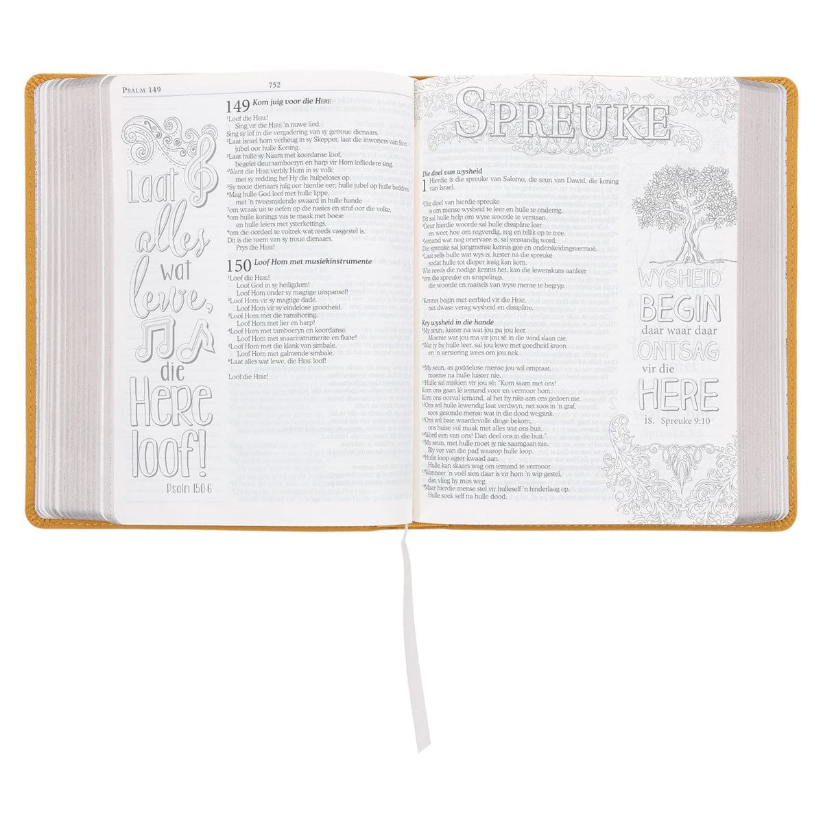 - Breë kantlyne met lyntjies spesiaal vir gedagtes, gebede, notas en ander persoonlike inskrywings