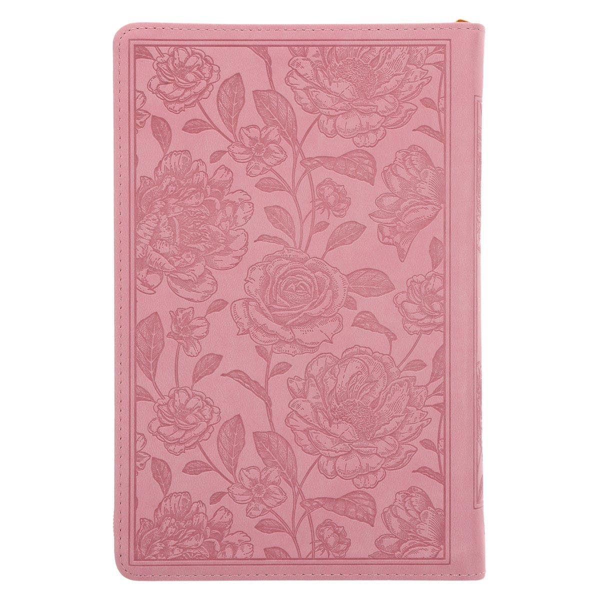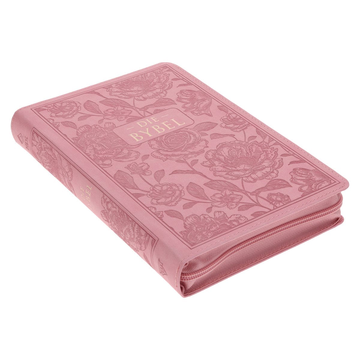 NLV Pienk Blomme Kunsleer Standaard Bybel Met Ritssluiter en Duimgrepe