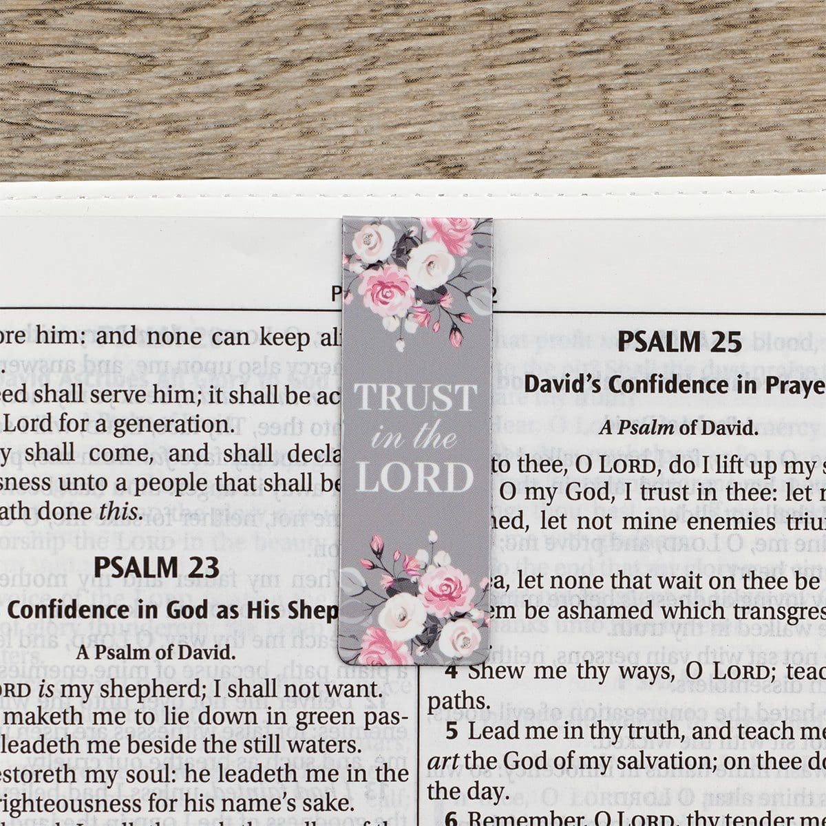The bookmarks in the Pink Roses Magnetic Bookmark Set are decorated with a matching light pink, gray, and fuchsia color palette, dainty roses, and a unique pattern. Biblical passages or messages are written in a combination of delicate cursive and elegant typescript.