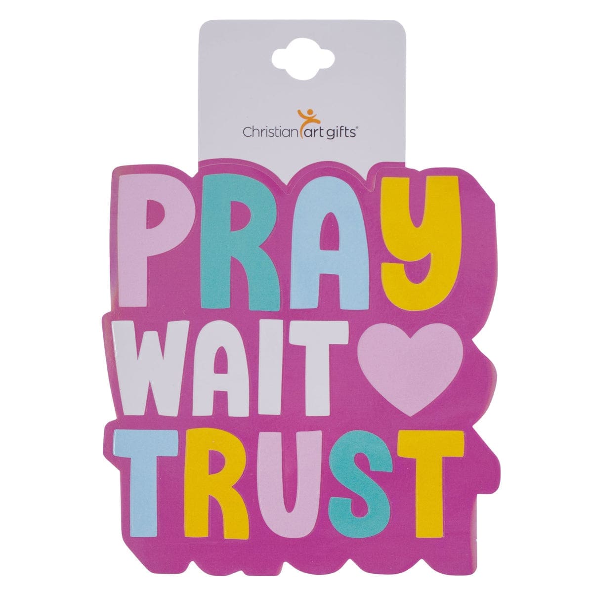 Add an uplifting touch to your belongings with this vibrant and inspirational sticker from Christian Art Gifts. Featuring an encouraging message of faith with the words “PRAY WAIT TRUST,” each word stands out in its own beautiful hue—purple, pink, blue and yellow separated by a charming heart symbol.