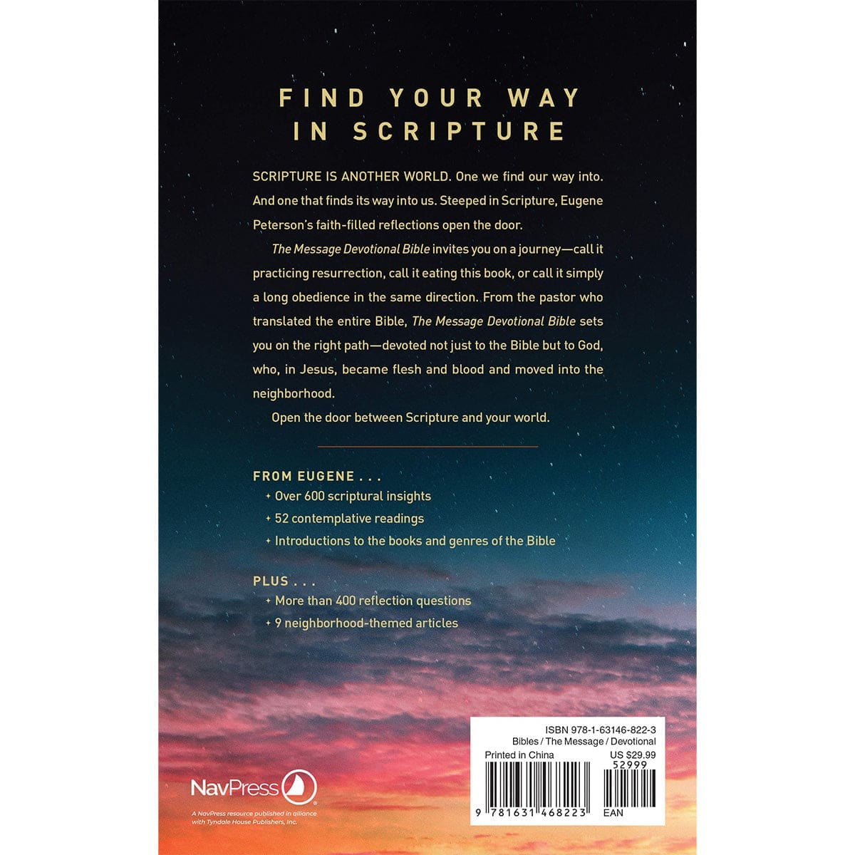 The Message Devotional Bible invites you on a journey—call it practicing resurrection, call it eating this book, or call it simply a long obedience in the same direction. From the pastor who translated the entire Bible, The Message Devotional Bible sets you on the right path—devoted not just to the Bible but to God, who, in Jesus, became flesh and blood and moved into the neighborhood.