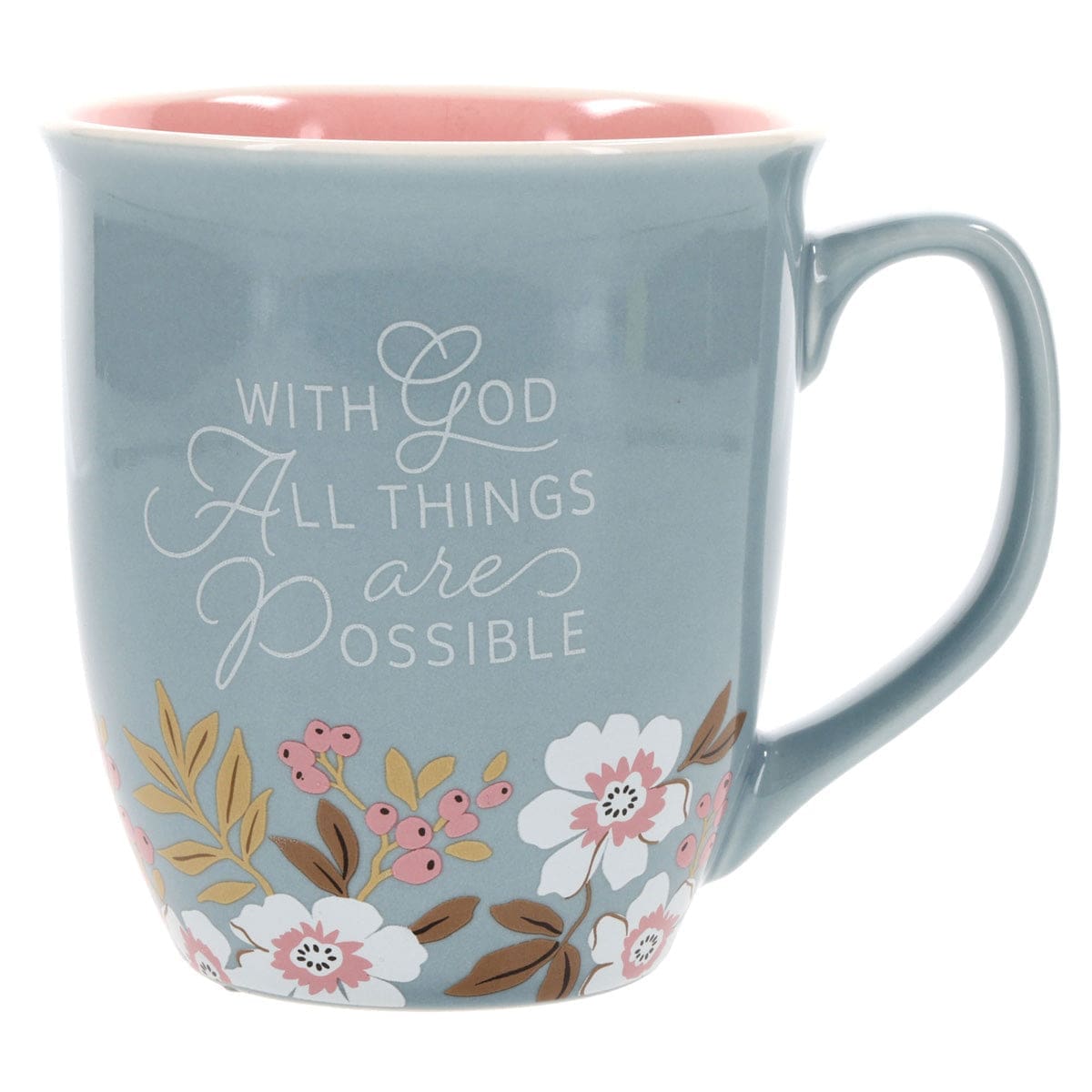 When life overwhelms you and you lose sight of what really matters, this elegant With God All Things Are Possible Teal Ceramic Mug with Pink Interior with its beautiful message will help you keep your eyes fixed on the Author of your faith.