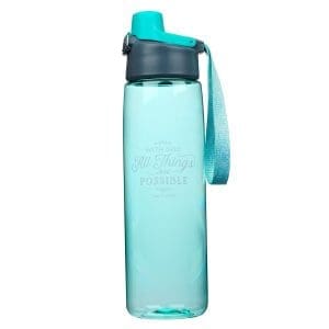 his teal athletic water bottle reminds Christians of an eternal, infallible truth: "With God, all things are possible" (Matthew 19:26). Those of us who are continually moving understand that a dependable water bottle is necessary! The vibrant teal of the BPA-Free Plastic Water Bottle is detailed with a delicate and artistic script. The design elevates a casual plastic bottle to a trendy one while spreading the Word with you wherever you go.