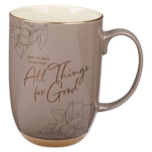 God Works Together All Things for Good Taupe Ceramic Mug with Cream Interior